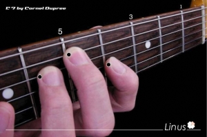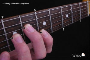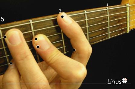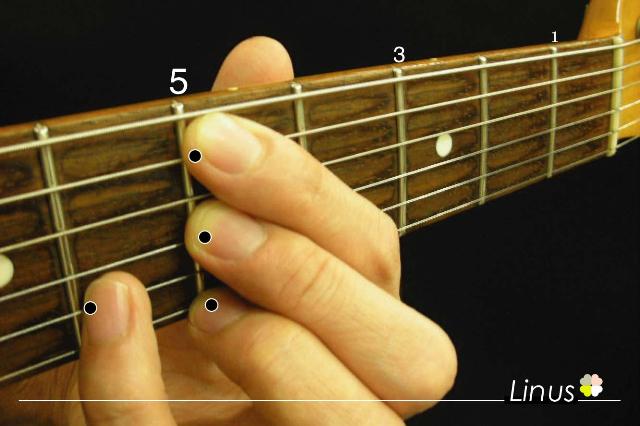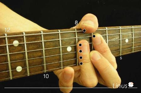 ■Root>5th>9th>3rd>5th>11th(low to high)と6本弦すべてを使いワイドストレッチで押弦するのでたいへん!ギターのNeckを顔に近づけると押さえやすいです ^ ^
